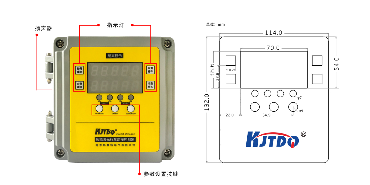 控制器功能主要是開機(jī)自檢功能,將激光傳感器接收到的信號(hào)進(jìn)行處理和計(jì)算,根據(jù)檢測(cè)到的距離,作出相應(yīng)的機(jī)電動(dòng)作(語音報(bào)警和PLC控制)。可在0.5-35m的量程任意設(shè)定兩個(gè)距離作為減速和停車,安裝在司機(jī)室或電氣室梁內(nèi):控制器的功能主要是將激光傳感器接收到的信號(hào)進(jìn)行處理,根據(jù)檢測(cè)到的距離,作出相應(yīng)的繼電器報(bào)警和減速,停車動(dòng)作,具有報(bào)警及語音提示等功能。
