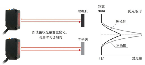 TOF方式是根據(jù)時間差來測量距離的,所以不受工件顏色、材質(zhì)的影響。因此、更換工件時無需任何調(diào)整便可穩(wěn)定感應(yīng)。